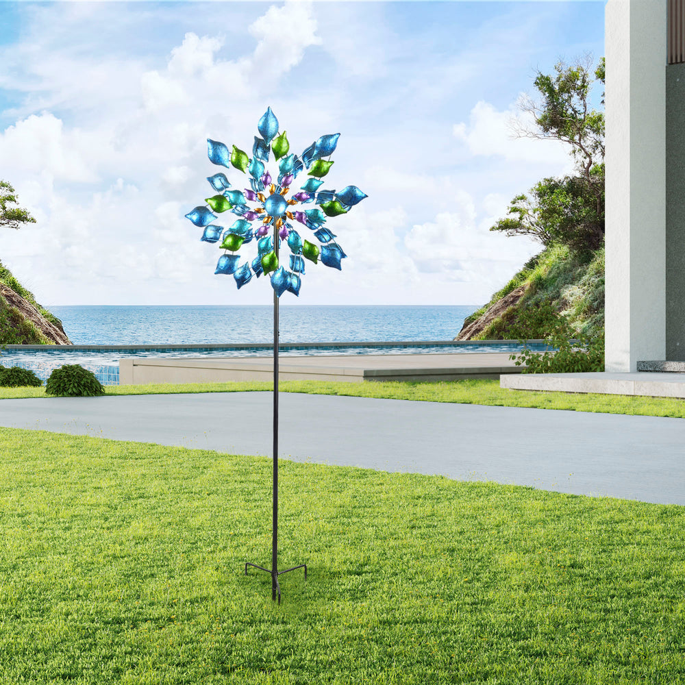 Colorful 18" dia. x 70" H Metallic Kinetic Windmill Spinner shaped like a flower on a stand.